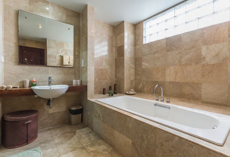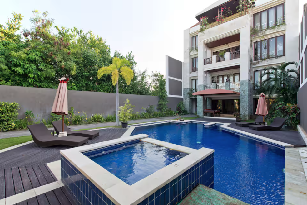 Located right behind the famous “Eat Street” in the heart of Seminyak, our spacious 125 sqm apartment offers all the comforts needed for an extended stay. Enjoy a 10-minute walk to renowned restaurants, boutiques, and supermarkets, or a 15-minute stroll to the beach. The unit features two full bedrooms with ensuite bathrooms, plus a maid’s room with a half-bath. The kitchen is fully equipped for gourmet cooking, and a large balcony overlooks a stunning swimming pool, complete with sun loungers and a jacuzzi (unheated).